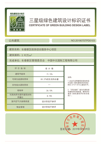 獲獎情況:獲吉林省住房和城鄉(xiāng)建設(shè)廳頒發(fā)的三星級綠色建筑設(shè)計標(biāo)識證書